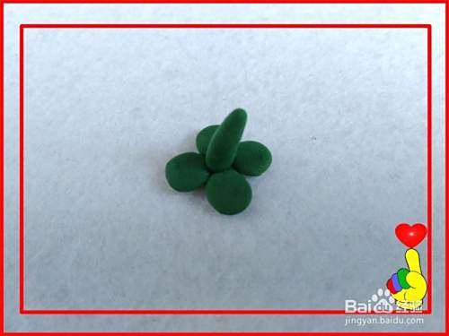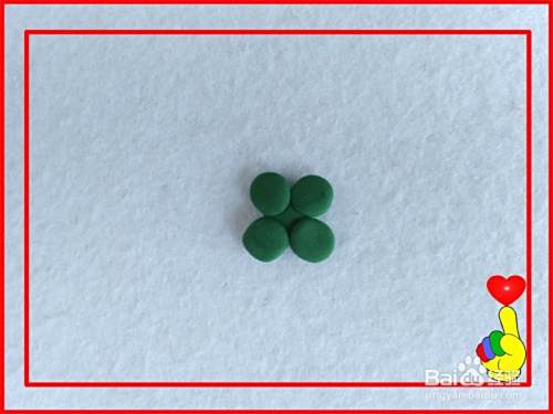 取绿色彩泥适量,滚搓5个小圆球,压成小圆片。