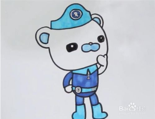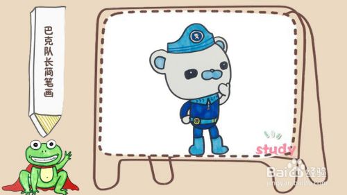 先画一顶帽子,画出头部轮廓与五官后,画出它的身体衣服与动作,一手叉腰,一手托腮,帽子、衣领、腰带以及鞋子全部涂上蓝色,眼睛涂黑,衣服涂成深蓝色,最后用深蓝色在帽子与衣领上画出线条纹路,简单的巴克队长就画好啦。