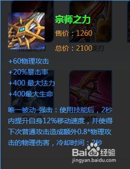 第五件装备选择宗师之力,增肌物理攻击、暴击率、最大生命和最大法力,并形成强击效果