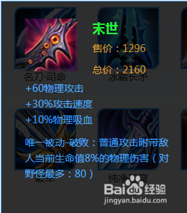 第四件装备选择末世,提高物理攻击、攻击速度和物理吸血,并形成破败效果