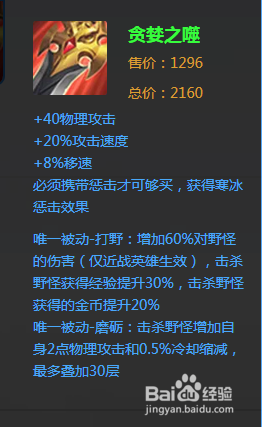 第一件装备选择贪婪之噬,增加物理攻击和攻击速度,并提高打野速度