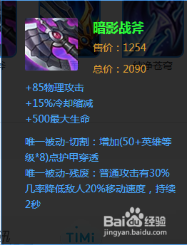 第三件装备选择暗影战斧,提高物理攻击和最大气血,降低技能CD,并增加切割和残废效果