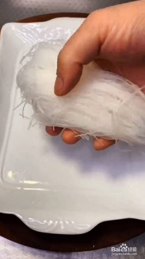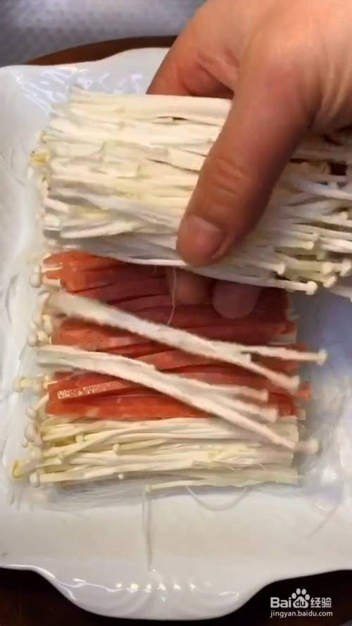 提前泡好的粉丝装盘垫底 ,再放上金针菇 火腿丝,最后再放上金针菇备用;