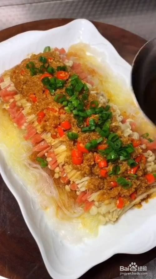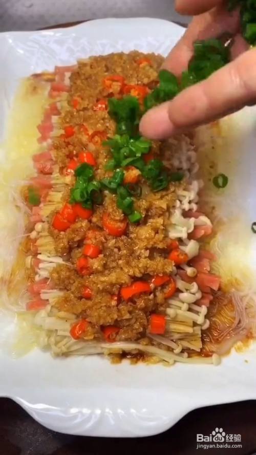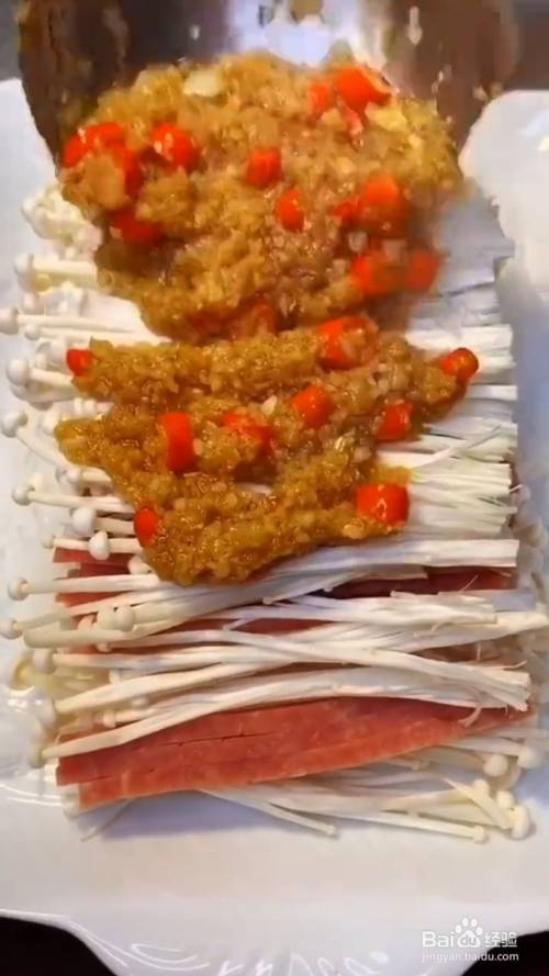 金针菇上边放入炒好的蒜蓉酱 ;
