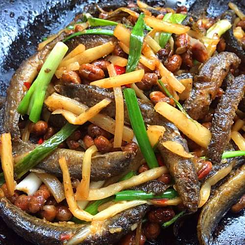 6然后热锅和干辣椒姜蒜末一起炒香,再放入炸好的泥鳅,加入一茶匙盐,两茶匙糖,料酒两茶匙,蚝油一茶匙,煸炒一分半钟,再加入黄豆,半碗淀粉水,小火焖两分钟撒香葱段后就可以起碟。