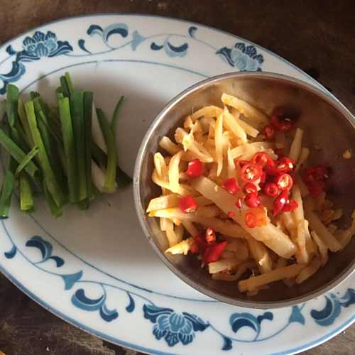 5酸笋(酸菜,酸豆角,泡菜都可以)切丝,小米辣和香葱切段。