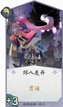 卡牌作用:一勾玉中的高加成攻击牌,还附带贯通效果,可以在前期就打出较大的优势,不过由于跳跳妹妹的负面能力,战斗牌需要额外消耗一点鬼火,这让我们如果在没有觉醒的情况下使用坏人走开,都要支付多一点鬼火。这张卡可以说是快攻跳妹的一种思路,毕竟高加成以及贯通都很贴合快攻思路,但是快攻中前期可以说是寸火寸金,所有携带上需要有所考量。觉醒后由于变为番茄,所以不用额外支付鬼火。