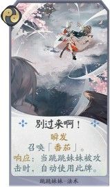 卡牌作用:瞬发召唤番茄,可以看到二勾玉开始我们召唤番茄的消耗就大大降低了,响应效果需要跳跳妹妹被攻击,主动让跳跳妹妹进到战斗区就要额外支付鬼火,不过瞬发响应牌怎么算都不亏。