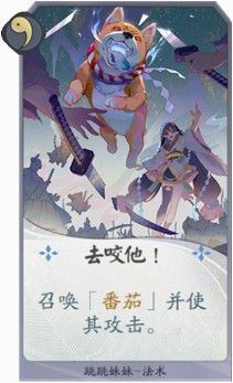 卡牌作用:一勾玉召唤番茄并攻击,如果战斗区有敌方式神则攻击战斗区敌方式神,如没有则番茄直接攻击对方牌手。简单有效的召唤番茄手段,因为番茄属于召唤物并不算式神,所以被解决后还可以继续召唤,召唤出的番茄拥有之前使用的增强番茄的法术牌效果。