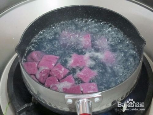 3.然后用铁锅放在火上,加入适量的清水煮沸,随后放入紫薯块煮至熟烂。