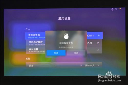 当投影自动检测到USB设备时,会在首页出现弹框,直接点击“打开”即可找到apk安装包,进行安装即可