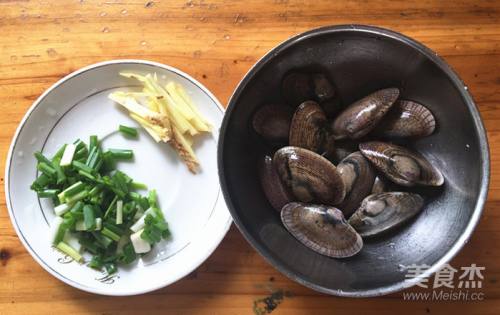 3生姜切丝,香葱切末,花蛤洗净。(精灵用的花蛤,是提前吐净泥沙的。)