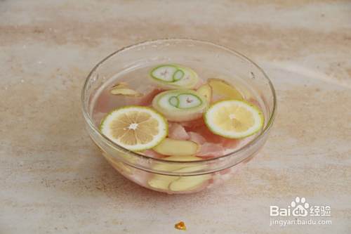 里脊肉切成小块,放入清水里泡出血水,放入几片姜片、大葱块、2片柠檬去腥;