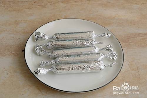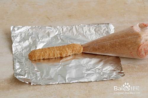准备好几块锡纸,装入裱花袋的肉糜挤到锡纸上;