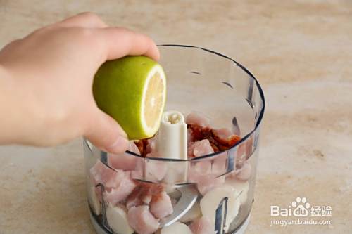 山药、里脊肉捞出沥干水分,放入料理杯,挤入几滴柠檬汁;