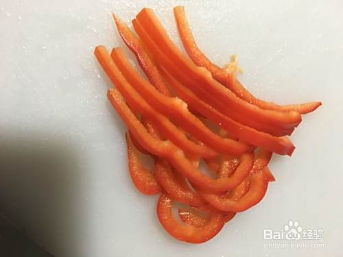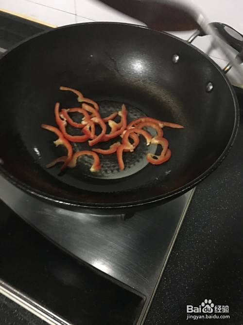 另取一锅,起锅热油,待油起小泡时倒入红彩椒翻炒两分钟,加入盐翻炒均匀。