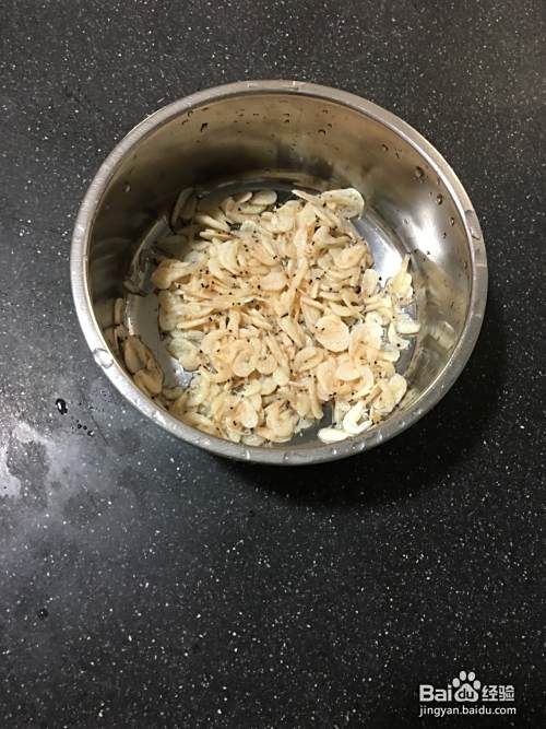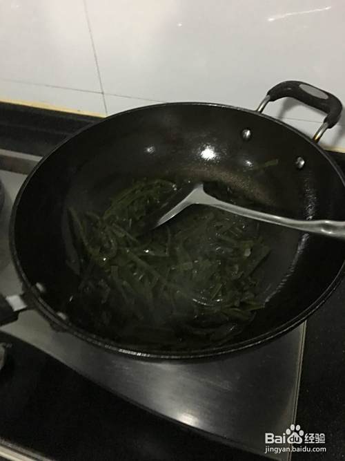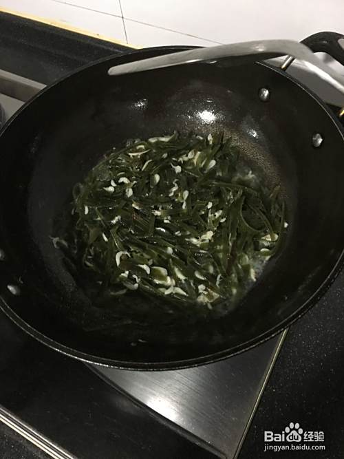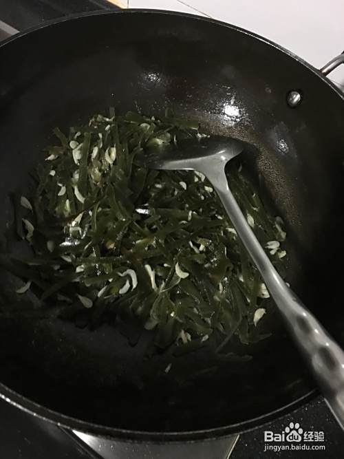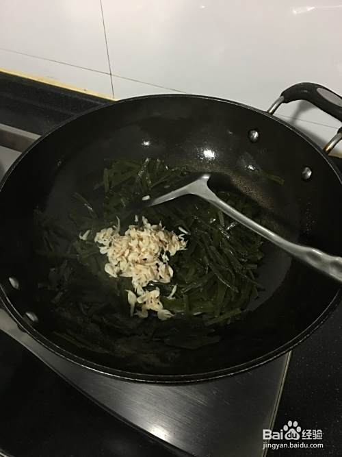 把锅烧热,倒入适量花生油,待油起小泡时倒入切好的海带丝和虾米翻炒1分钟。