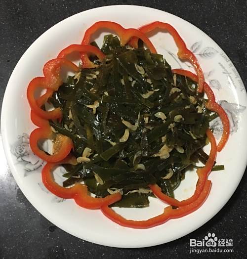 把海带丝装碟,用红彩椒摆盘装饰,一道清爽可口、香味浓郁,颜值又高的虾米炒海带丝就大功告成了,简单又好吃,营养又丰富,伙伴们,自己在家做起来。