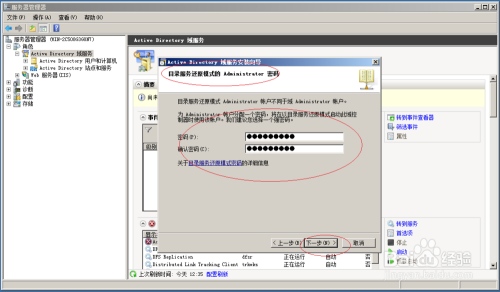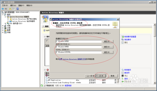 设置保存数据库、日志文件和SYSVOL的路径,输入目录服务还原模式的Administrator密码。