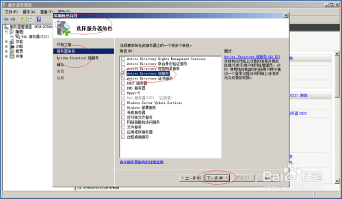 弹出"添加角色向导"对话框,勾选"服务器角色→Active Directory域服务"复选框。