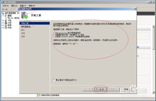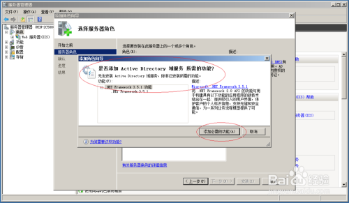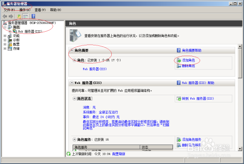 唤出"服务器管理器"程序窗口,点击"服务器管理器→角色→添加角色"图标。