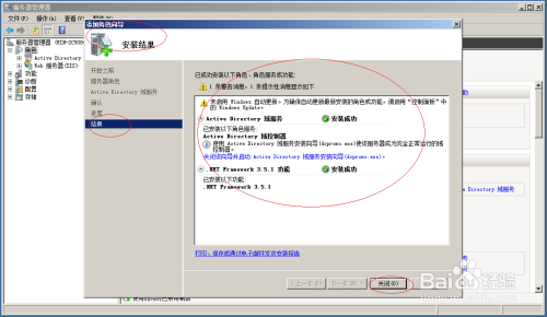 显示安装结果信息,点击"关闭"按钮关闭添加角色向导。