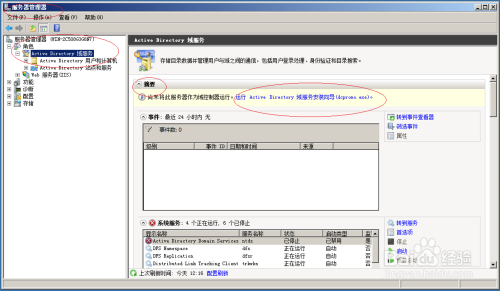 唤出"服务器管理器"程序窗口,点击"服务器管理器→角色→Active Directory域服务→摘要→运行Active Directory域服务安装向导(dcpromo.exe)"图标。