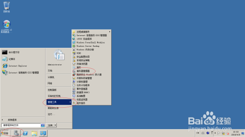 唤出任务栏开始菜单,选择"管理工具→服务器管理器"项。