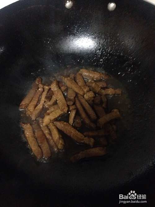 放一点点油,下肉条,放一勺生抽半勺老抽半勺白糖,量自己控制即可,喜欢甜多放点糖,翻炒,变色后加水,没过一半肉即可,大火收汁