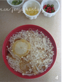 捞起金针菇和海蜇丝,立刻放入冰柠檬水里浸泡5分钟。