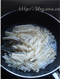 锅下水烧开后,放入金针菇、海蜇丝焯水10秒。