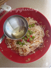 再把金针菇、海蜇丝放入大碗中,把蒜姜茸、辣椒粒、香菜段及熟芝麻及调料淋入碗中,淋上1茶匙麻油。