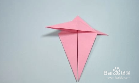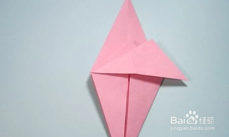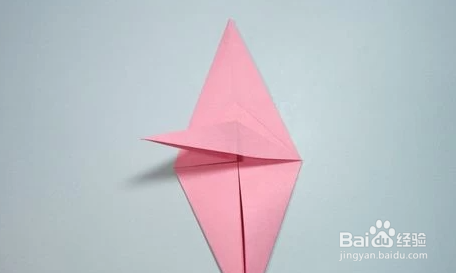 将双正方形分叉这侧正面和背面四条边折向中线,对齐。将上面顶角沿着两三角形的边翻折过来。