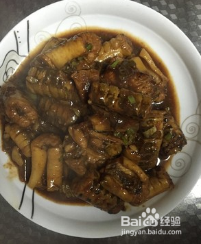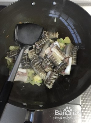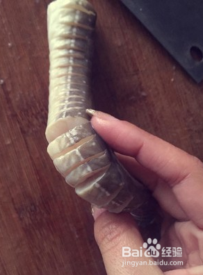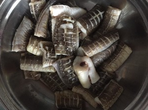 海鳗洗净去肚子里的所有东西,在背部左右全都割出均匀的花,不要切断哦!