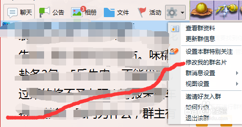 我们必须加入一个群,然后看到群的界面。点击群设置。可以修改自己在群里的群名片。