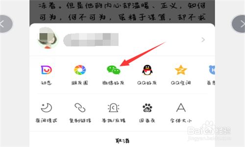 到了文章的阅读界面之后,我们看到右上角的三个点点,点击它,会有分享的选项,选中分享功能按钮。