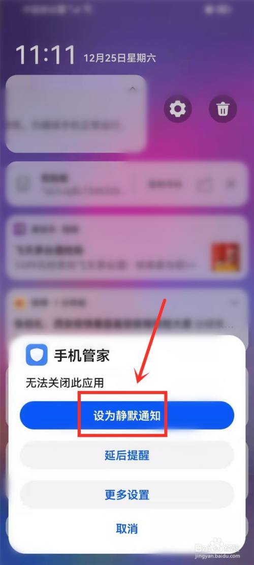 在弹出的窗口中点击【设为静默通知】,即可关闭手机管家弹出的通知。。