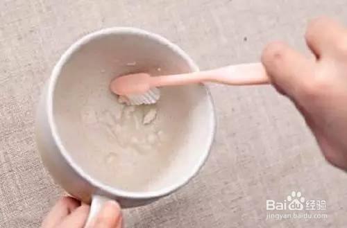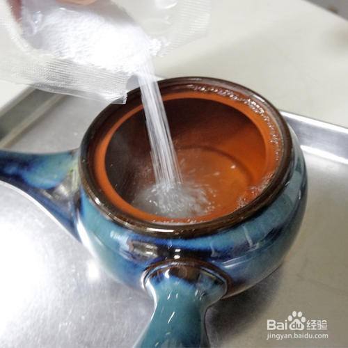 往茶壶中倒入适量的食用碱(食用碱能够溶解茶壶里的茶碱)。接着往茶壶中挤入一段牙膏(牙膏具有清洁去污的作用)。