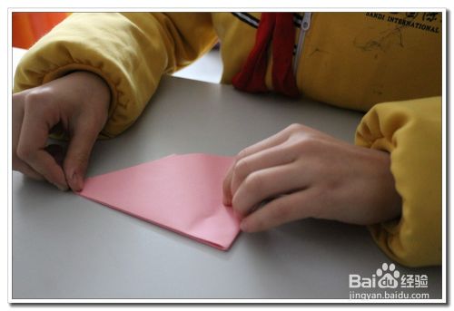 4、如图所示,将对折后的角,从中间位置往下折叠。