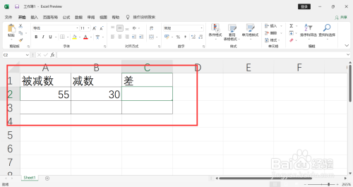 在EXCEL表格中创建减法计算表,在被减数和减数单元格内输入数据。