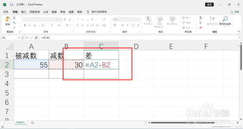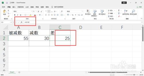 按下回车,单元格内显示出减法结果,上方状态栏上显示出减法公式。