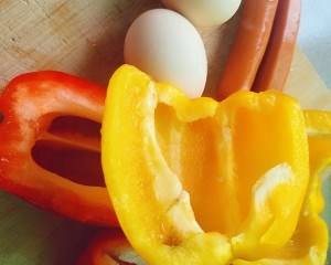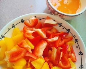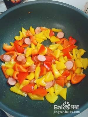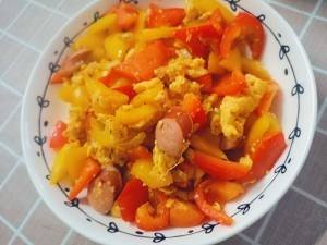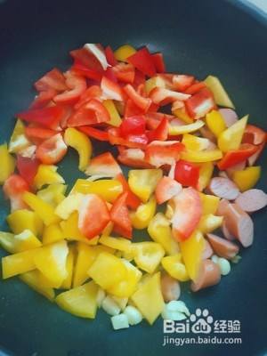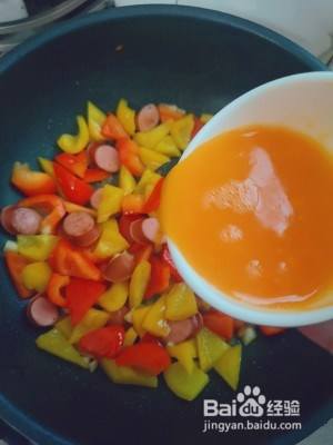 红椒,黄椒切滚刀 .鸡蛋碗里打散加盐。香肠切片