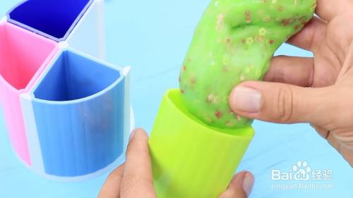 接着我们把准备好的软泥放入准备好的笔筒里面。