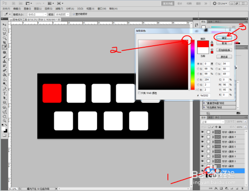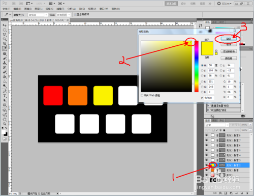 点击“图层1”前面的小方块,弹出拾取实色对话框后,将颜色设置为红色。按照同样的步骤依次给每个圆角矩形更换不同的颜色(如图所示);