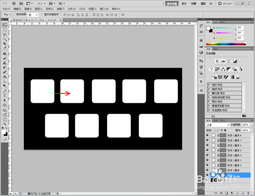 点击【圆角矩形工具】,点击上方【形状图层】图标,设置圆角量为20,颜色选择白色后,在作图区域绘制一个白色色块(注:形状图层可进行颜色更改)。完成后,按住【Alt】键拉动复制出多个圆角矩形色块;