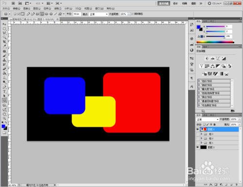 点击【圆角矩形工具】,点击上方【填充像素】图标,选择不同的前景色,绘制出红黄蓝三个小色块 (可以看到,由【填充像素】制作的色块为一个普通图层,不能进行颜色更改。),调整好模式和透明度即可。