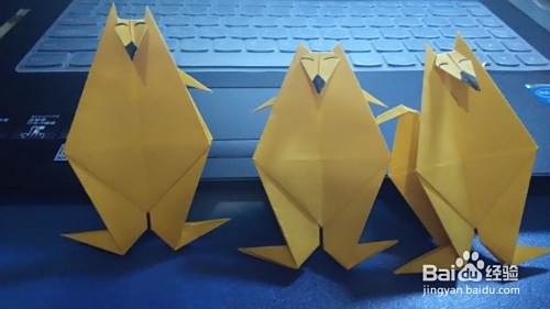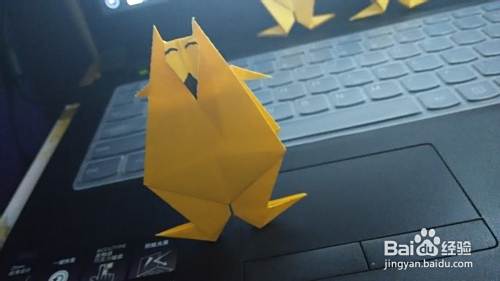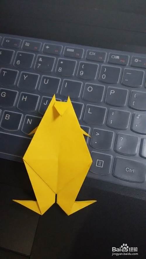 接下来把纸张的下半部分,分别在中心线往上二分之一处向外折出脚,画上眼睛和嘴巴就完成了。是不是很活灵活现啊!