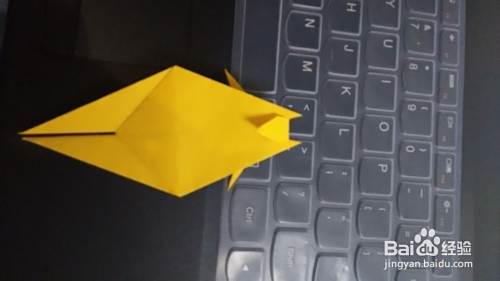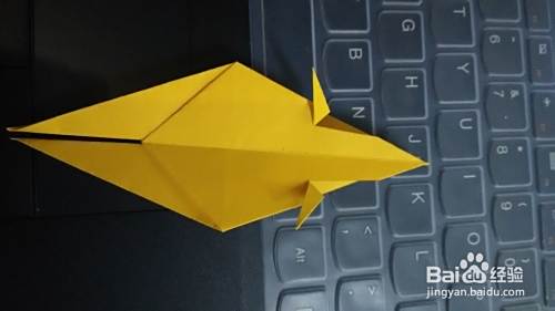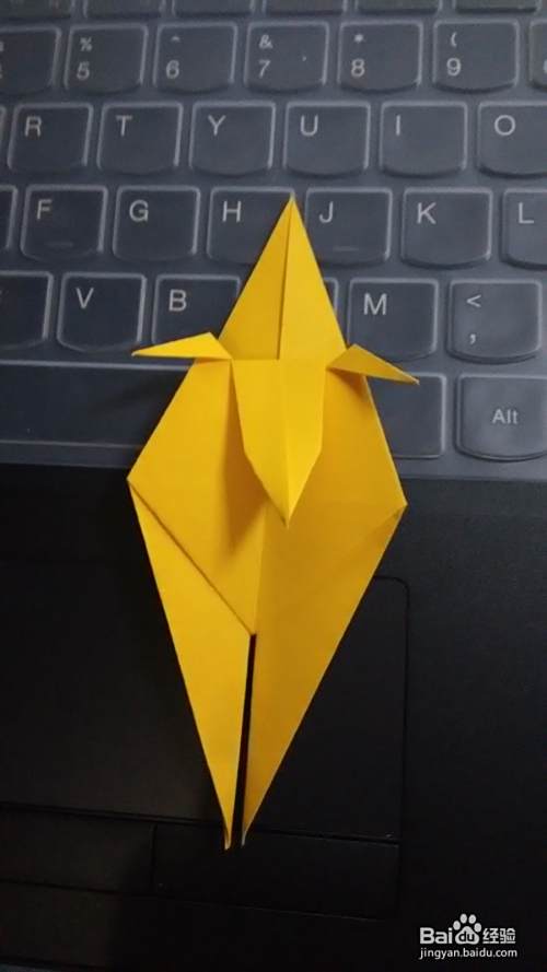 再把中间较宽的部分向下折,适当折歪一点 ,这样尾巴就折出来了