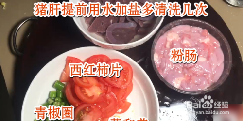 首先我们将西红柿和青椒切成圈,姜蒜切成末备用,粉肠切成3厘米左右的小段,猪肝提前用水加盐多清洗几次,去掉血水。