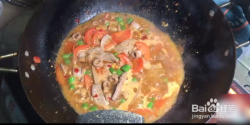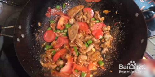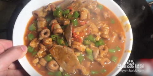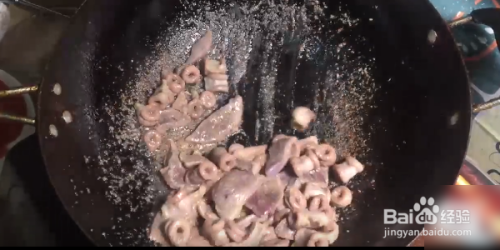 2油热后加入粉肠煸炒,炒至变色起焦皮加入猪肝
